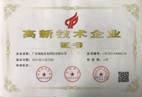 熱烈祝賀翔海光電獲得《高新技術企業證書》