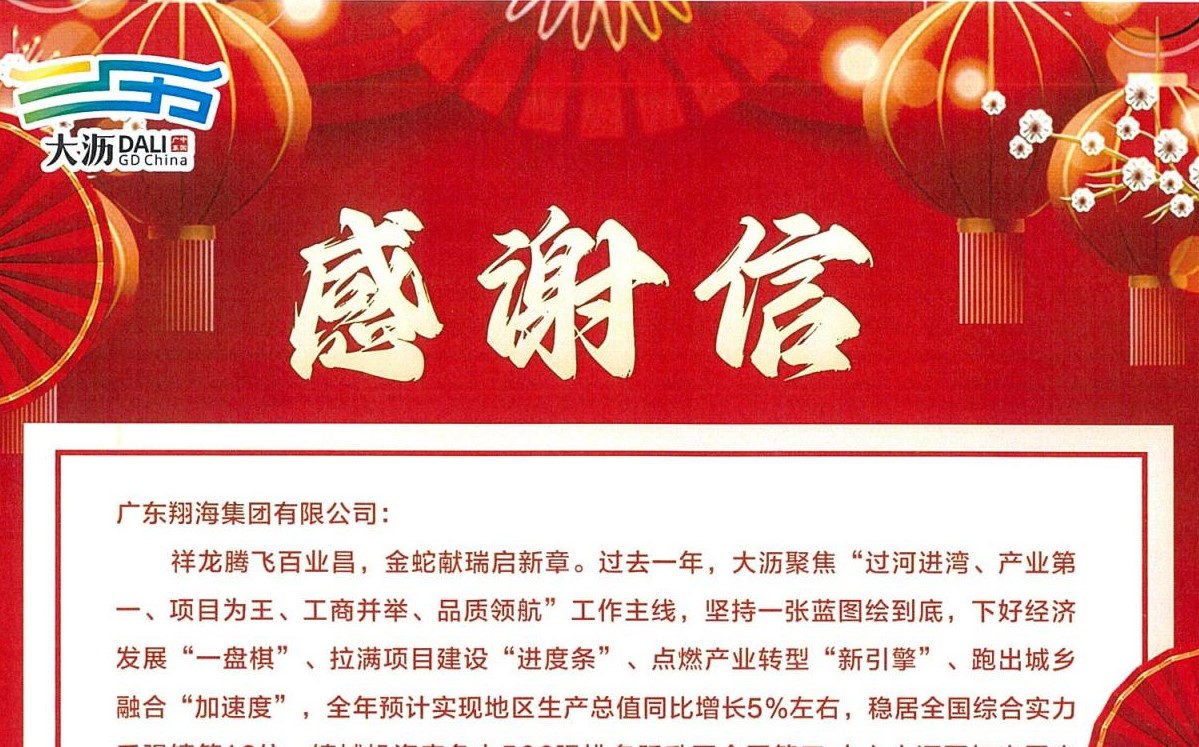 廣東翔海集團有限公司深感榮幸,新春之際收到了一封來自大瀝鎮政府的感謝信。作為大瀝的本土企業,我們深知企業的成長離不開當地政府和社會各界的支持與厚愛。在此,我們衷心感謝大瀝鎮委鎮政府,感謝各位合作夥伴的鼎力支持和信任。 展望未來,我們將繼續深耕行業,不斷提升自身的核心競爭力。同時,我們也期待與各位合作夥伴保持更加緊密的合作關系,共同開創更加美好的未來,建設高質量發展新大瀝。 在此,廣